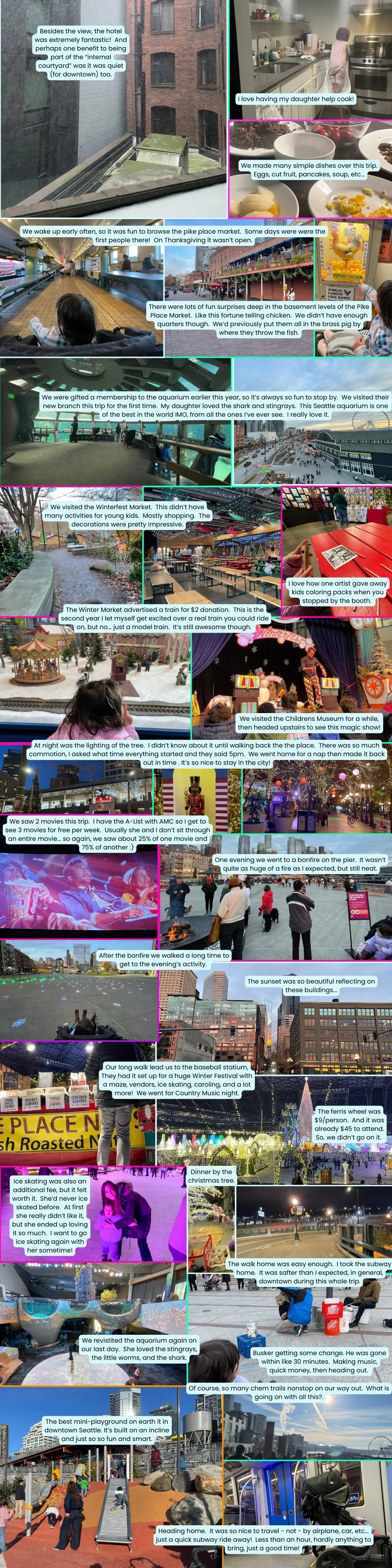 MORNING: We planned to attend a parade later this day, but then I realized the parade was part of the Winter Festival downtown by the Space Needle.. but that event just wasn’t that fun and I didn’t want to possibly spend $20+ on more tickets to go watch a parade. Of course, probably I had this info wrong and the parade was free, but I didn’t want to risk it. Instead, we had a bit of a “best of nearby” hangout. First, we went back to the aquarium. My daughter really loves the new section of the aquarium, (and, yes, this second visit, knowing more of what to expect, I warmed up to it a lot. It’s super great for her to run around inside). Also we had good food this whole day, I cooked everything we had left and we ate throughout the day from that food.
