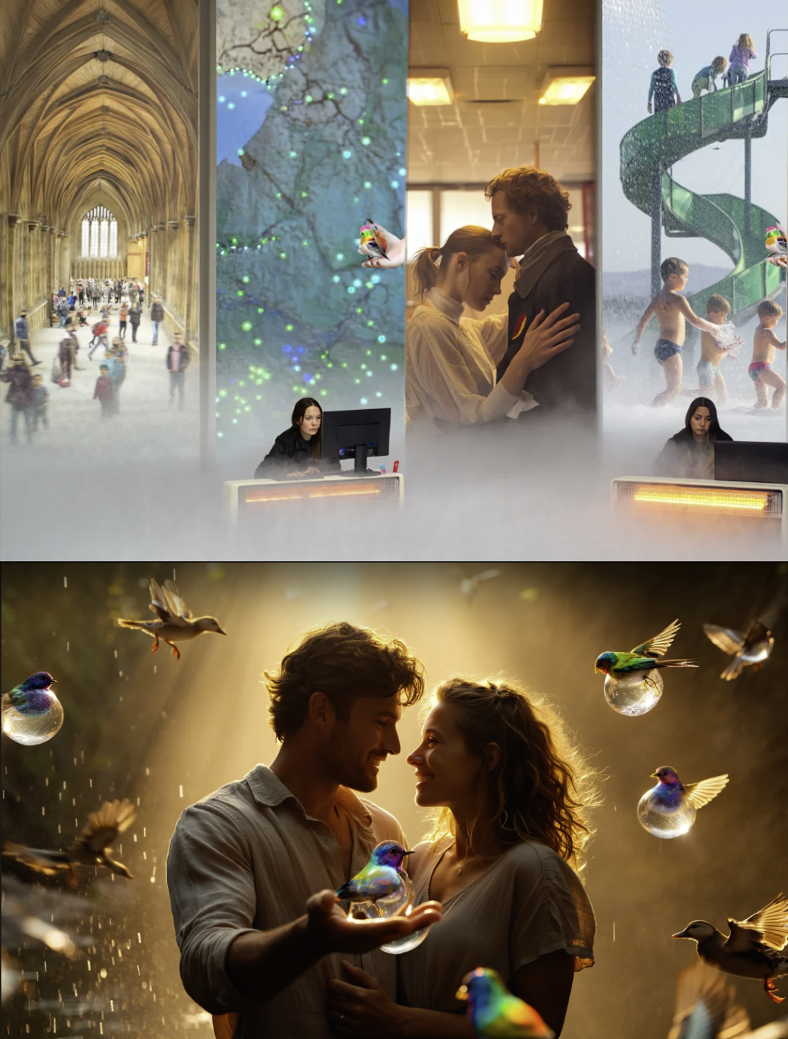 So, then these kids are like, some of them didnt do a good job cleaning themselves up after lunch and I notice they’re wet, but then suddenly, (the ceiling was so high but then with shorter parts, like were were in sorta food court almost with different areas that were shorter) and then suddenly the like fire sprinkelers go off, but they’re more sorta fancy than that. And then it starts pouring down water lightly, but increases over time. So we run and try to find somewhere to go and get out of the water, me and my partner.
