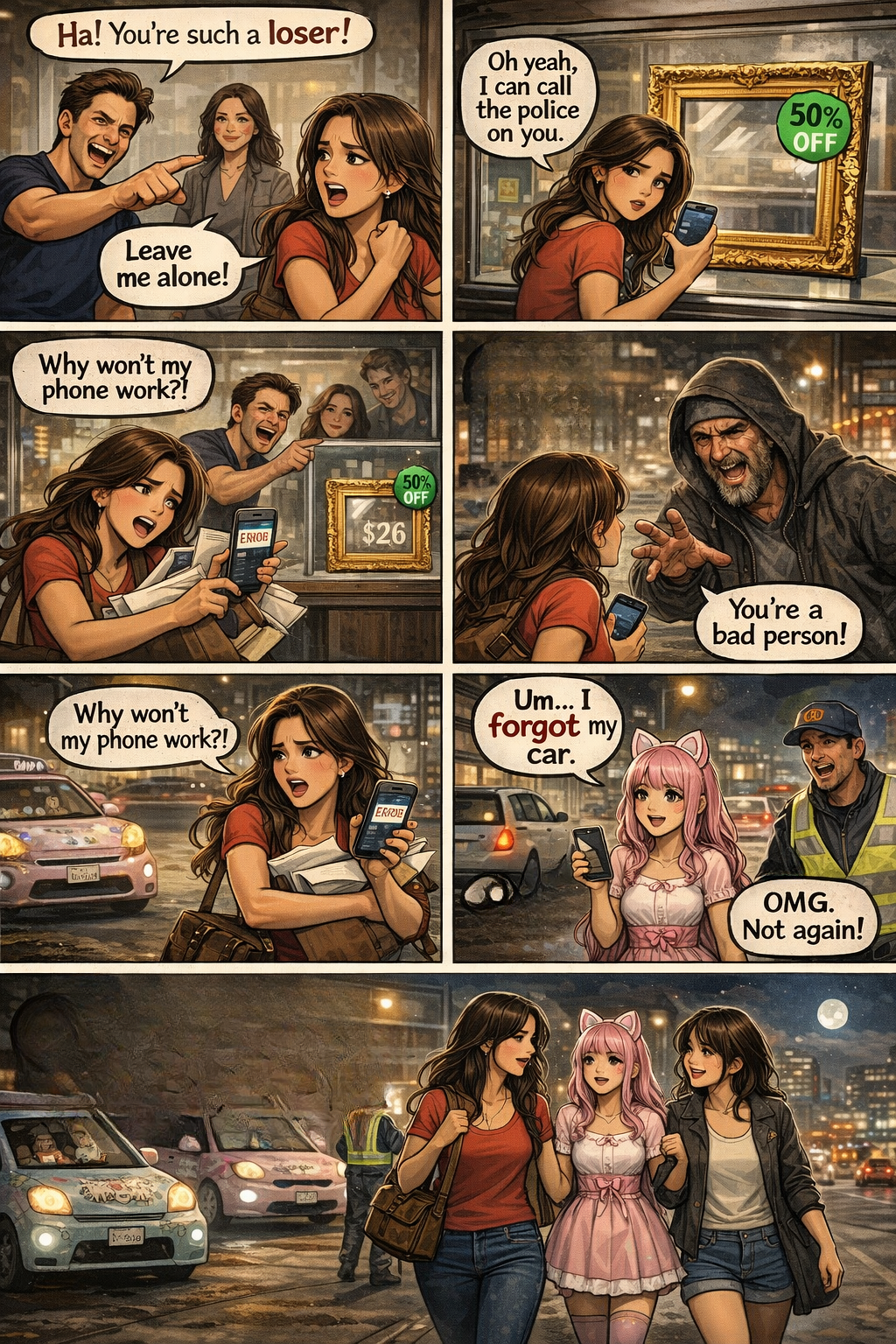 So finally I get through this parking lot over to the other side, away from that guy. And it’s a really busy part where there is a main road nearby and I’m near a lot of traffic lights, right where you turn into the parking lot. And I decide to call a lyft, and then I’ll try the police again.  And I am able to call the Lyft successfully, and they are almost there.  Like so many cars pull in front of me, which have almost the exact same license plate as the one I’m waiting for but it’s not them. All the cars are decorated so cute, too. Like Kawaii style and tiny cute cards. But finally when the lyft gets there, it’s just a girl… no car.  And she’s liek oh… I forgot my car.  It’s only her there.  And she’s like this cute Kawaii girl, too.